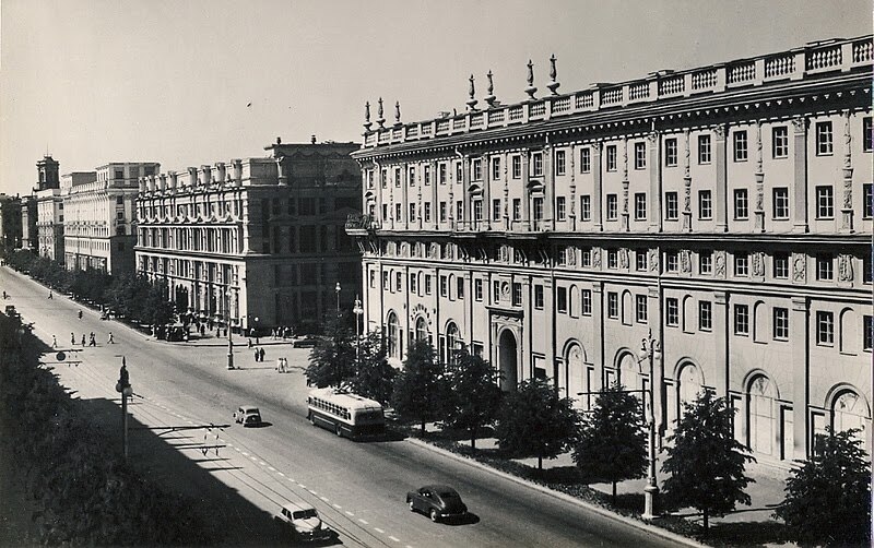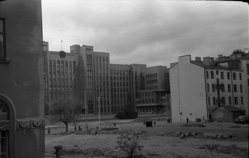 А самы, бадай, прыгожы будынак на праспэкце пасьпелі завяршыць да хрушчоўскай пастановы – ён знаходзіўся насупраць гатэлю: