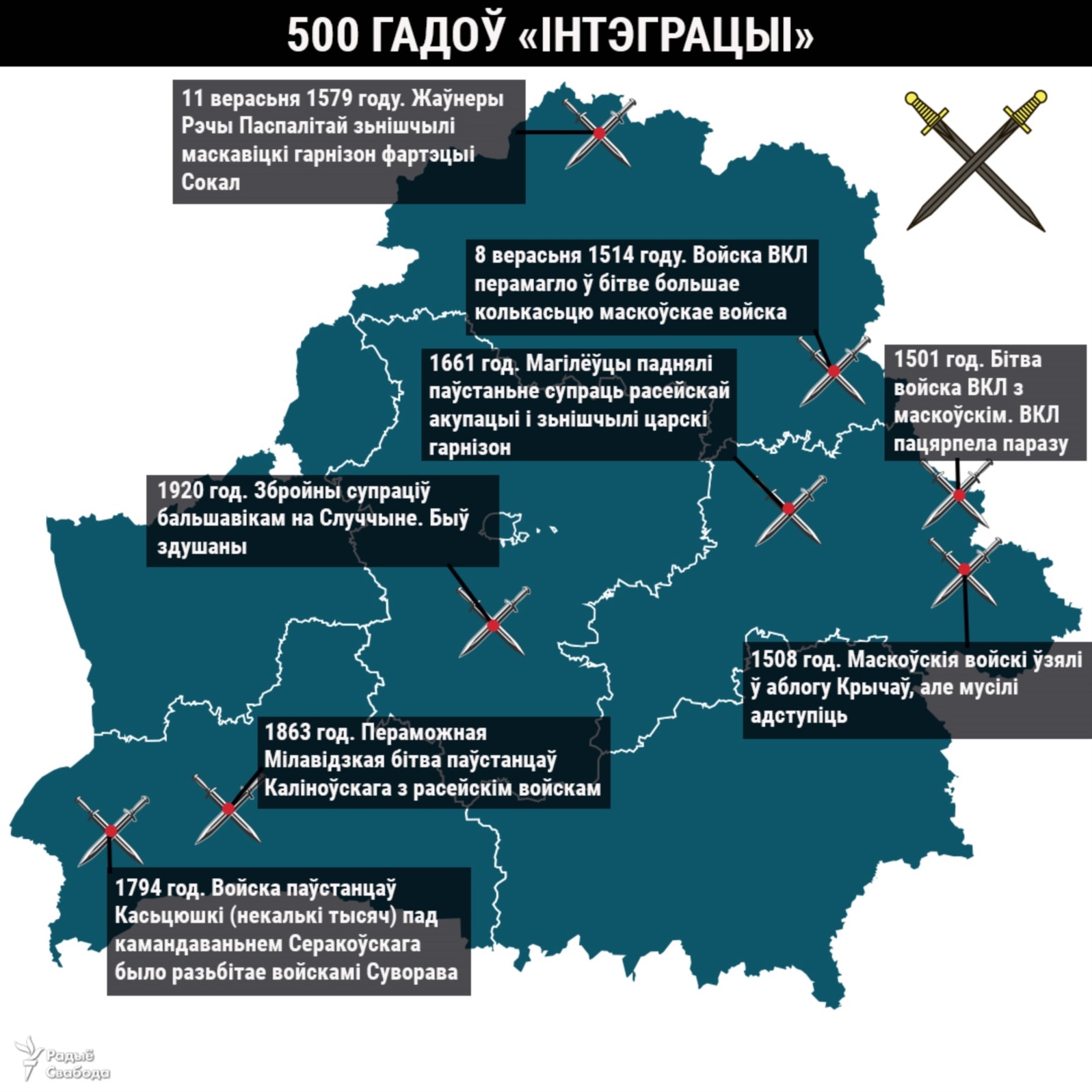 У Сярэднявеччы ВКЛ і Маскоўская дзяржава шмат ваявалі паміж сабой, гэтая гісторыя мела працяг і ў XX стагодзьдзі. Мы сабралі на мапе некаторыя бітвы, якія адбываліся на тэрыторыі сучаснай Беларусі.